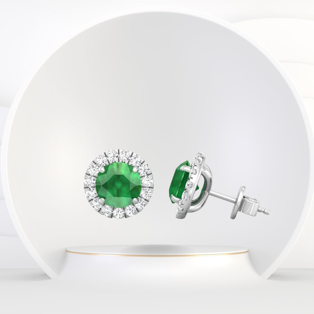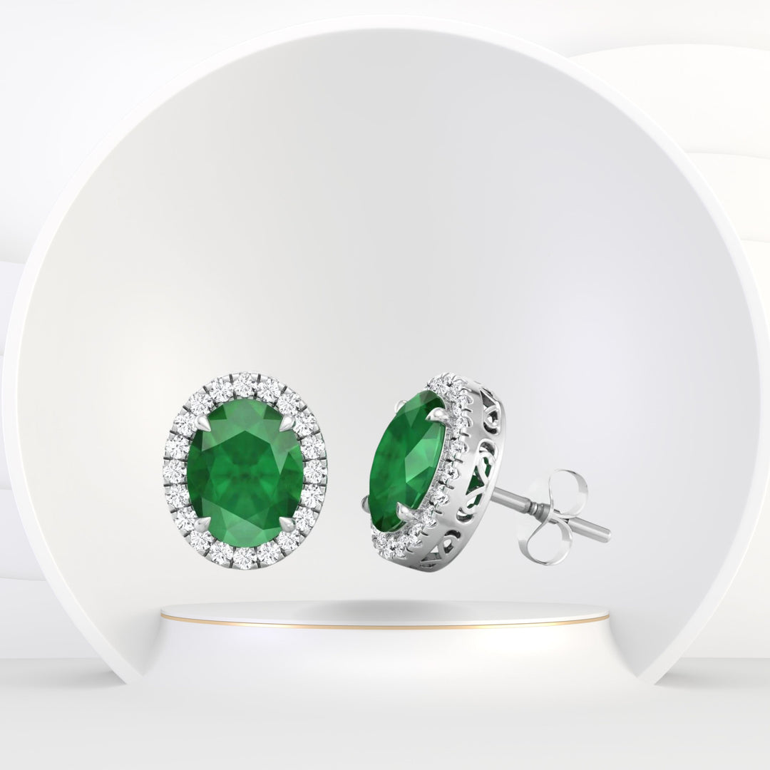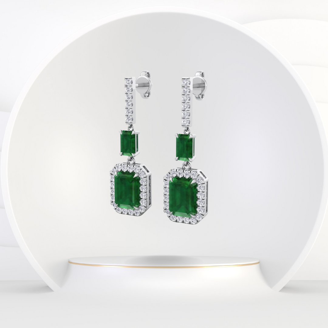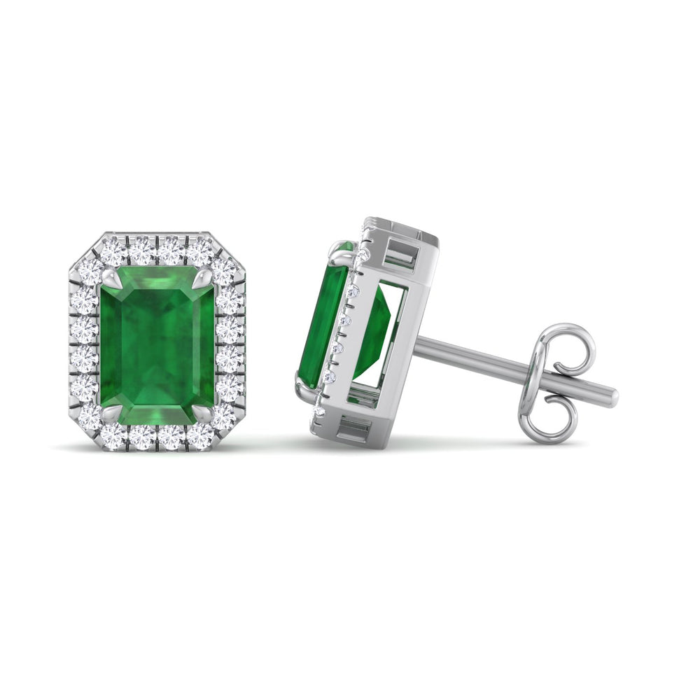 - Genio - Emerald Cut Green Emerald Diamond Halo Earrings