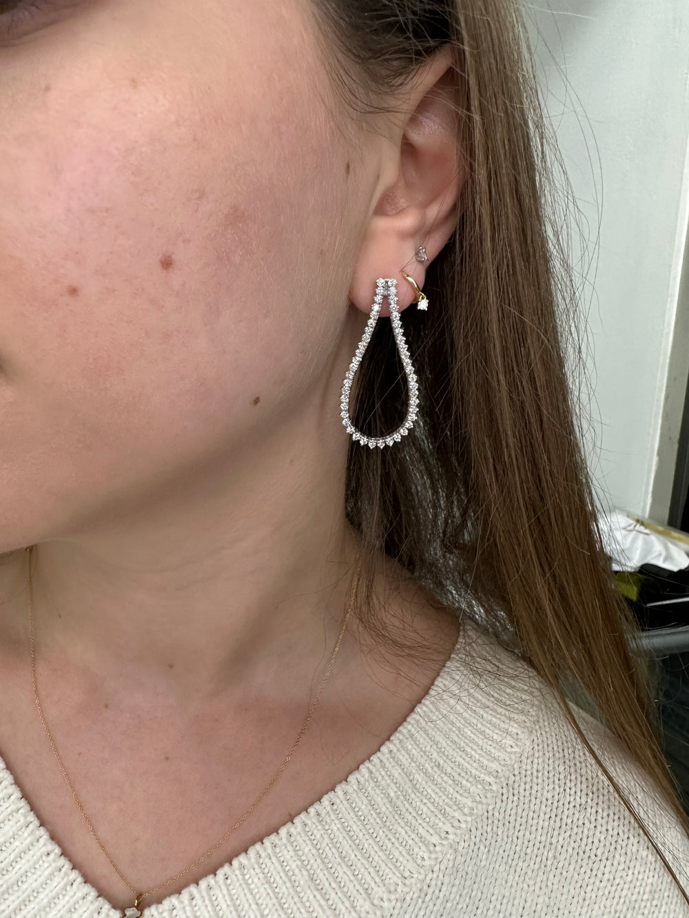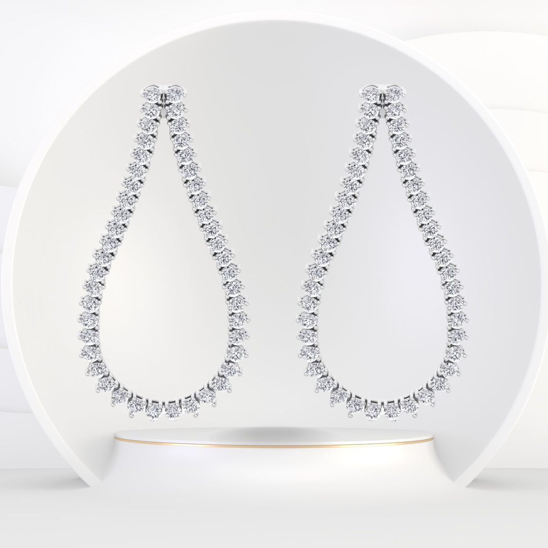 Teardrop Shape Hoop Earrings: This shape combines the traditional hoop layout with a luxury teardrop shape. It features a single, big diamond at the teardrop's tip, accentuated by more miniature gemstones along the hoop's edge. Teardrop earrings are available in snap and hinge closures, delivering safety and convenience without compromising style.