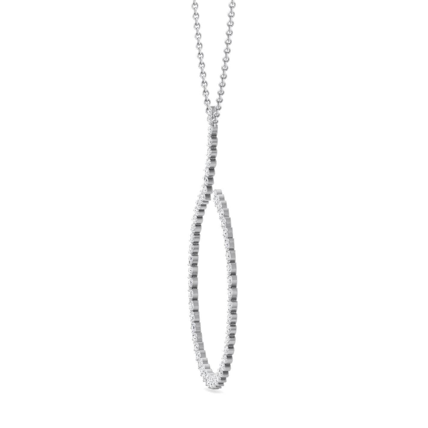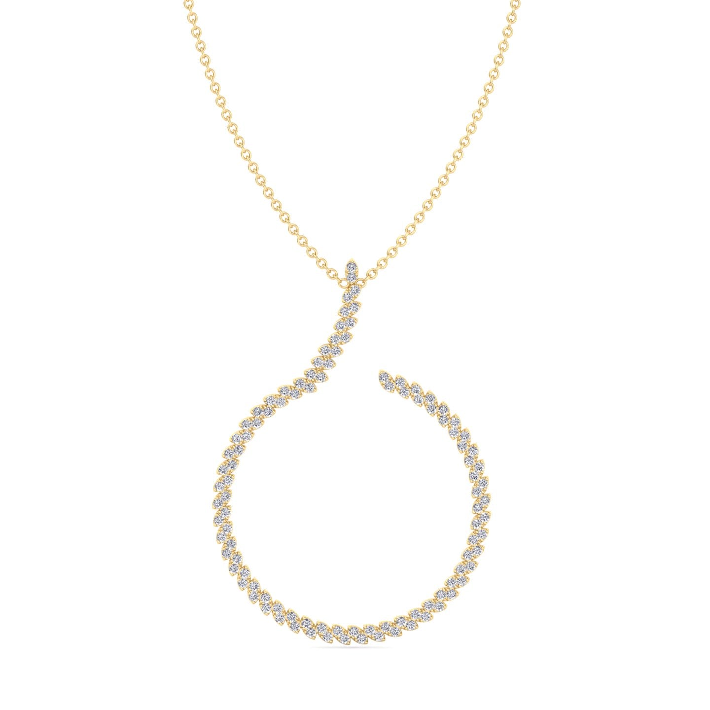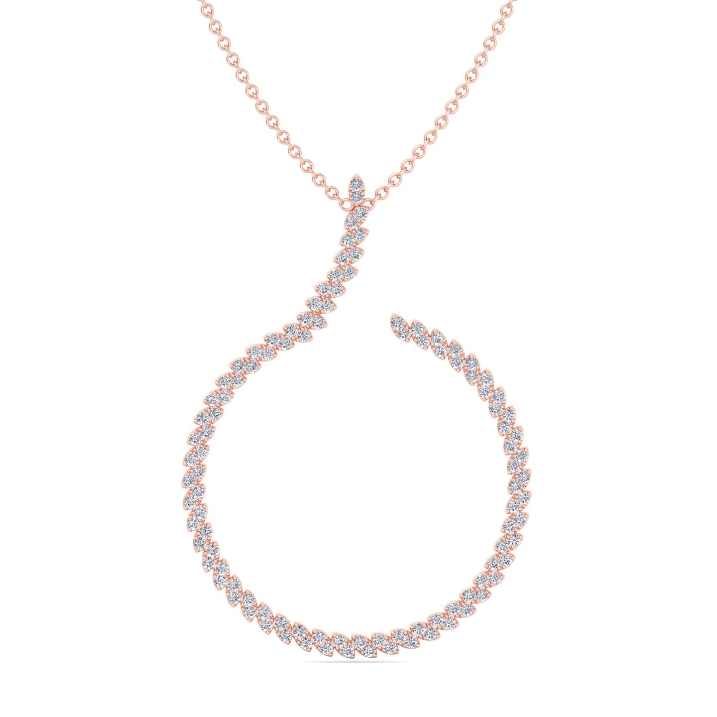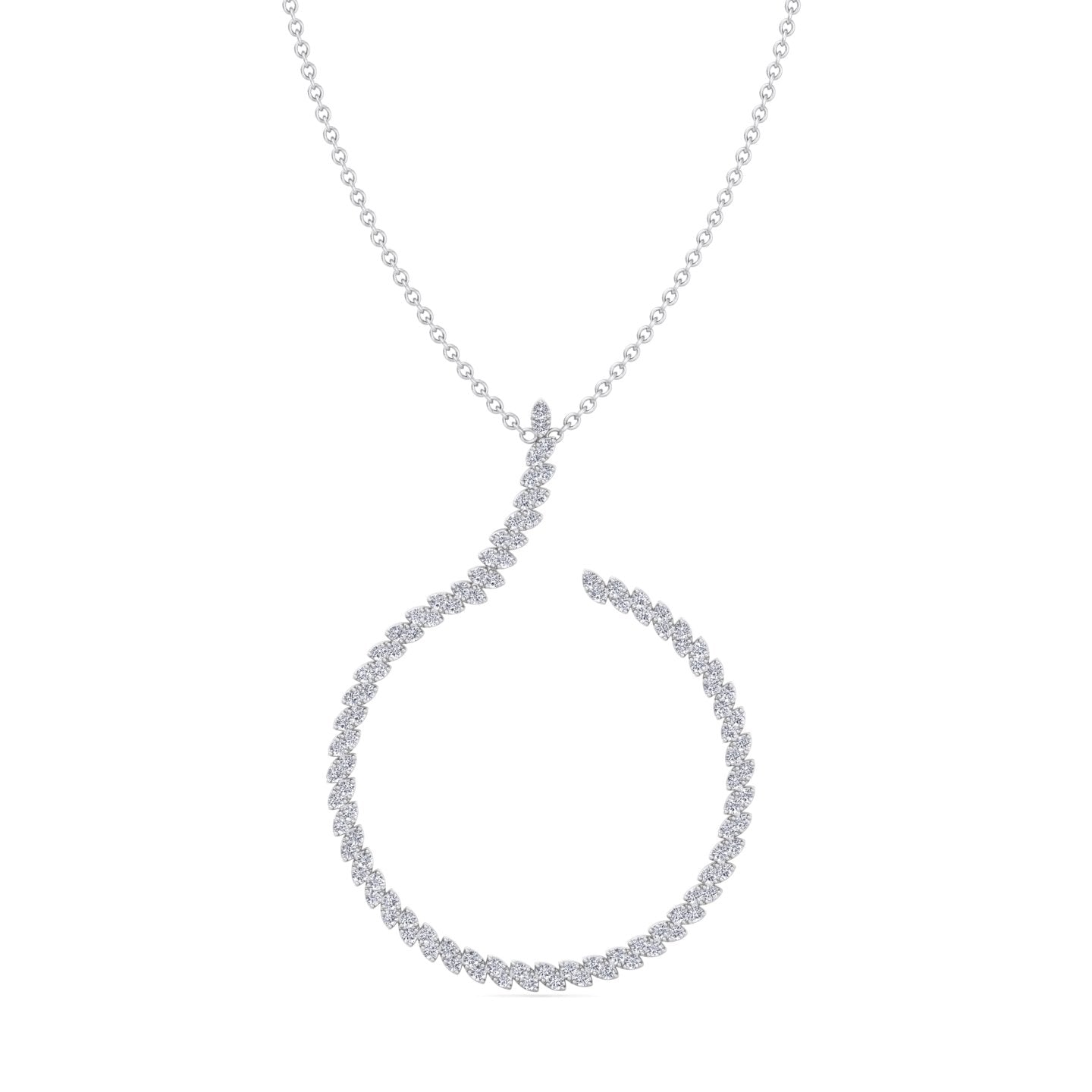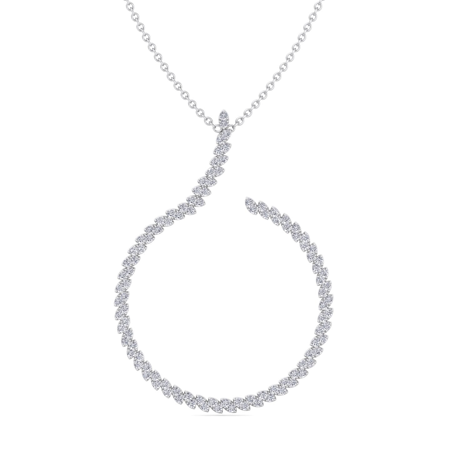 This circle swirl pendant features an elegant marquise-shaped design, each section pave set with brilliant round diamonds for maximum sparkle. The flowing pattern creates a graceful hook-like form, giving the pendant a refined yet modern appeal.