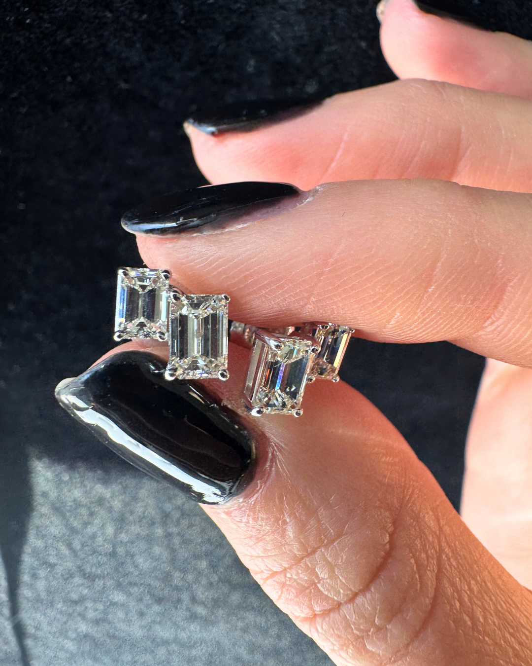 The Double Emerald Shape Natural Diamond Studs bring a sculptural elegance to your jewelry collection. Featuring two emerald-cut natural diamonds in graduated sizes, this striking design stacks a larger diamond above a smaller one in an elevated, asymmetrical form—creating a refined, architectural look with a touch of edge. The clean lines of the emerald cut are celebrated in this modern silhouette, making it a standout piece for those who appreciate bold minimalism.