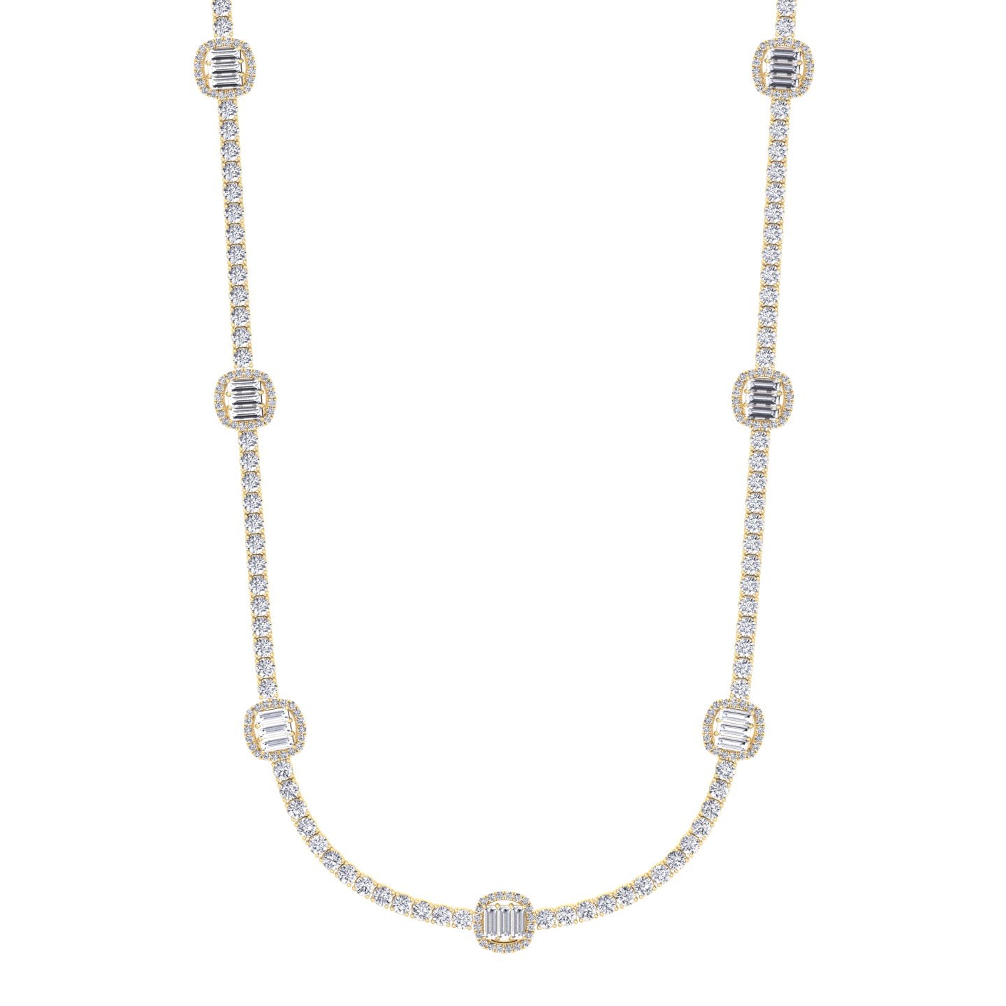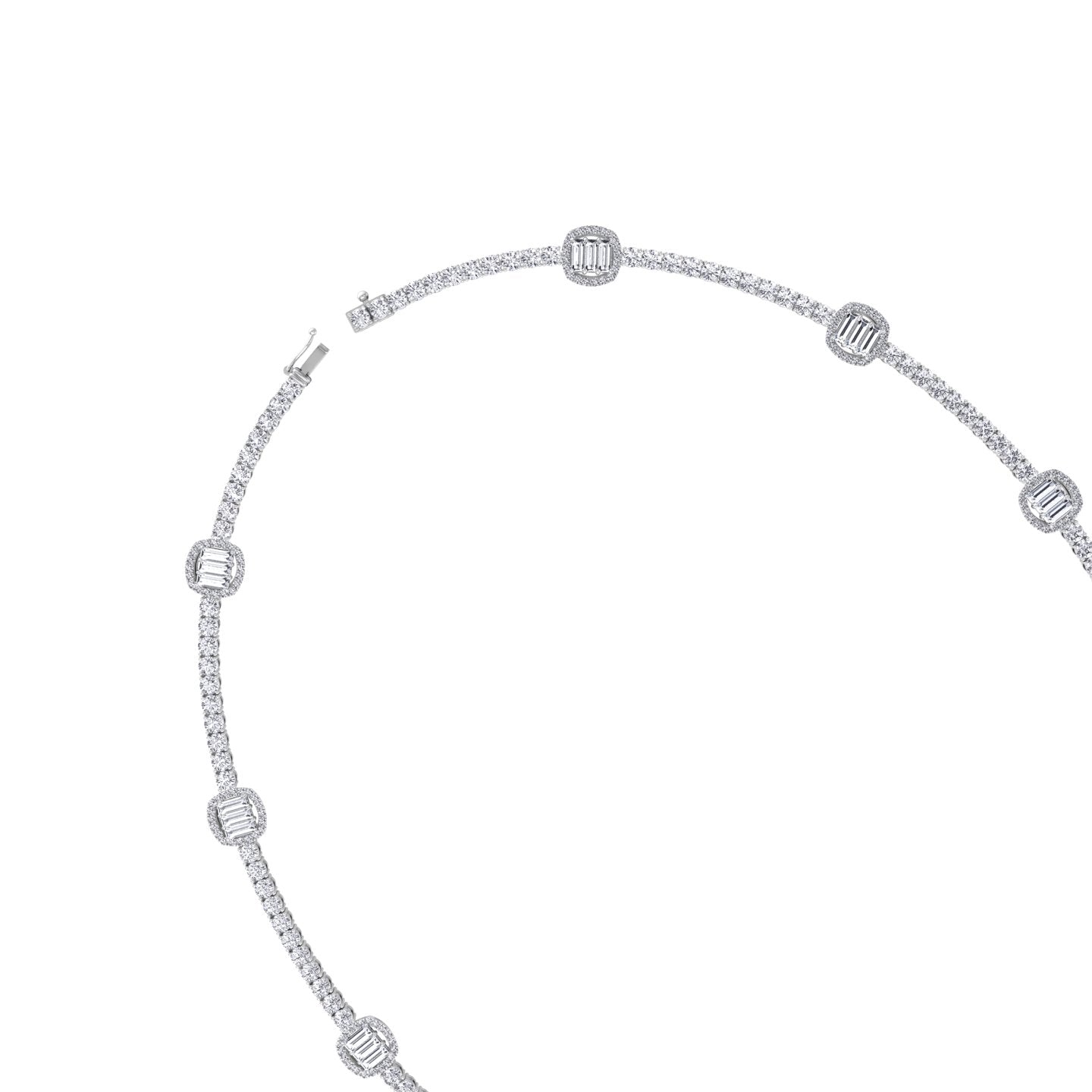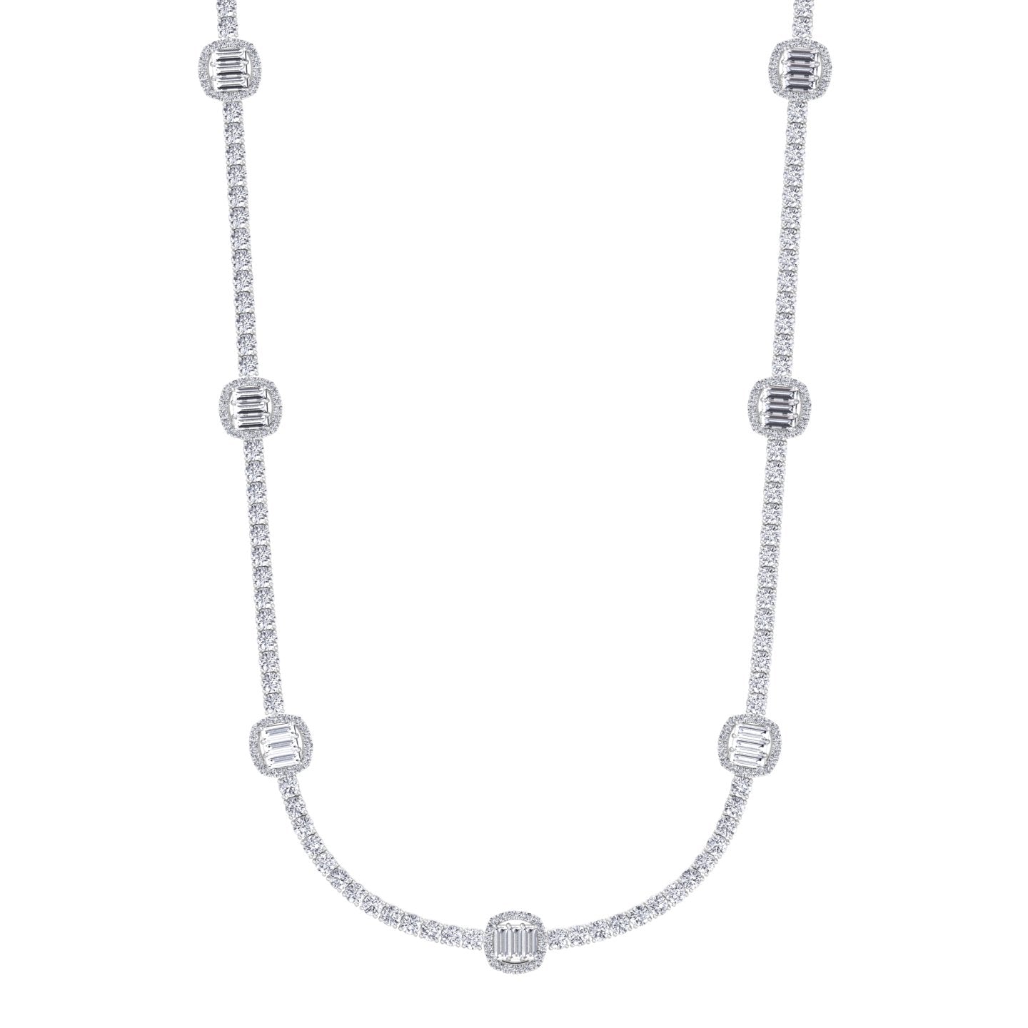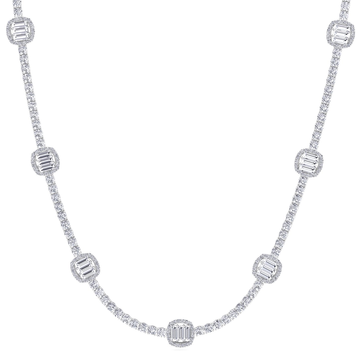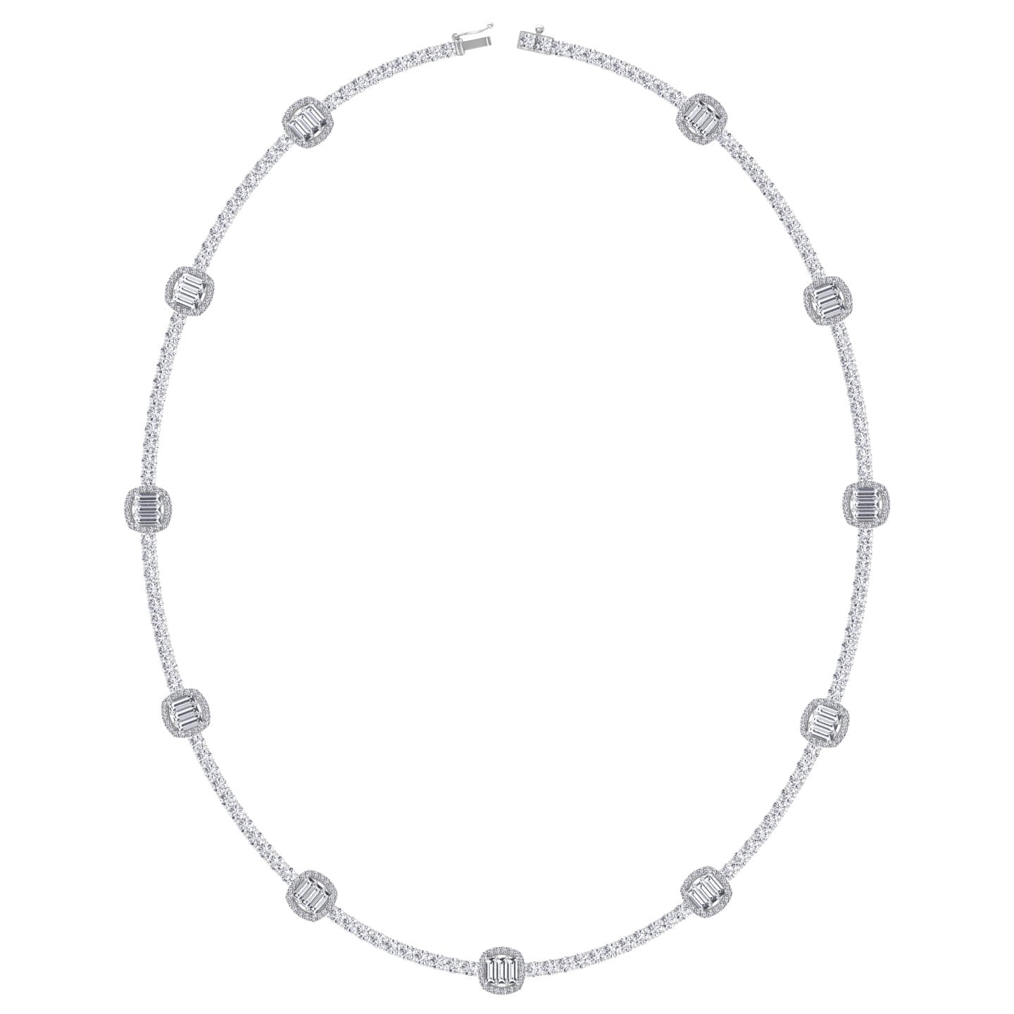 This elegant tennis necklace features a refined round diamond design accented with striking emerald-shaped halo stations, creating a captivating balance of classic and contemporary style. Each diamond is set in a secure four-prong setting, offering exceptional brilliance and a seamless, fluid sparkle that enhances any neckline.