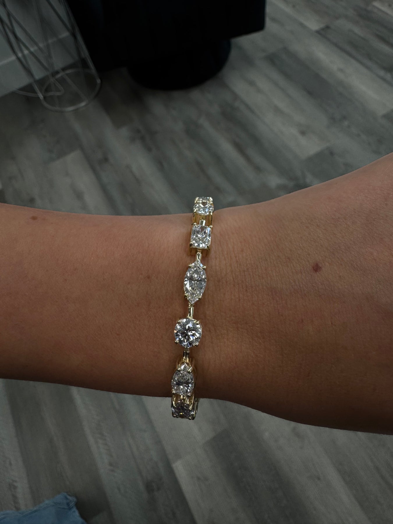 This elegant tennis bracelet features a captivating mix of round, oval, pear, radiant, and marquise-shaped natural diamonds. Each stone is expertly secured in a prong setting, allowing light to flow through beautifully while highlighting the unique shape of every diamond. Designed with deliberate spacing between each stone, the bracelet offers a refined, airy look that enhances its brilliance and charm.