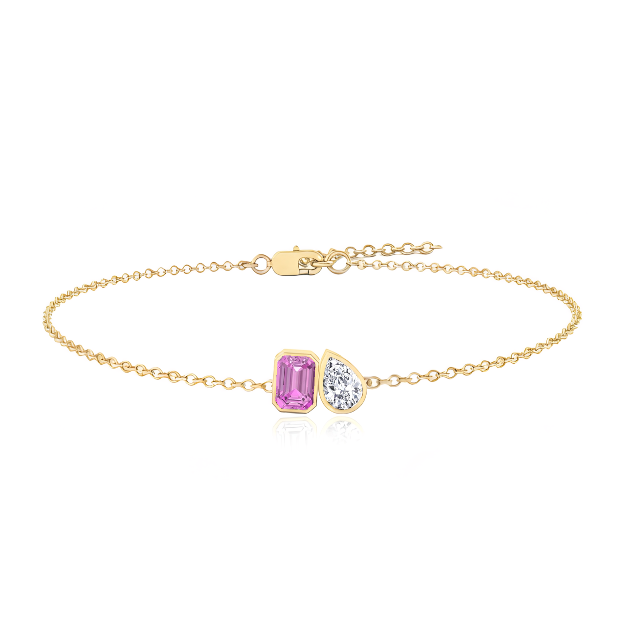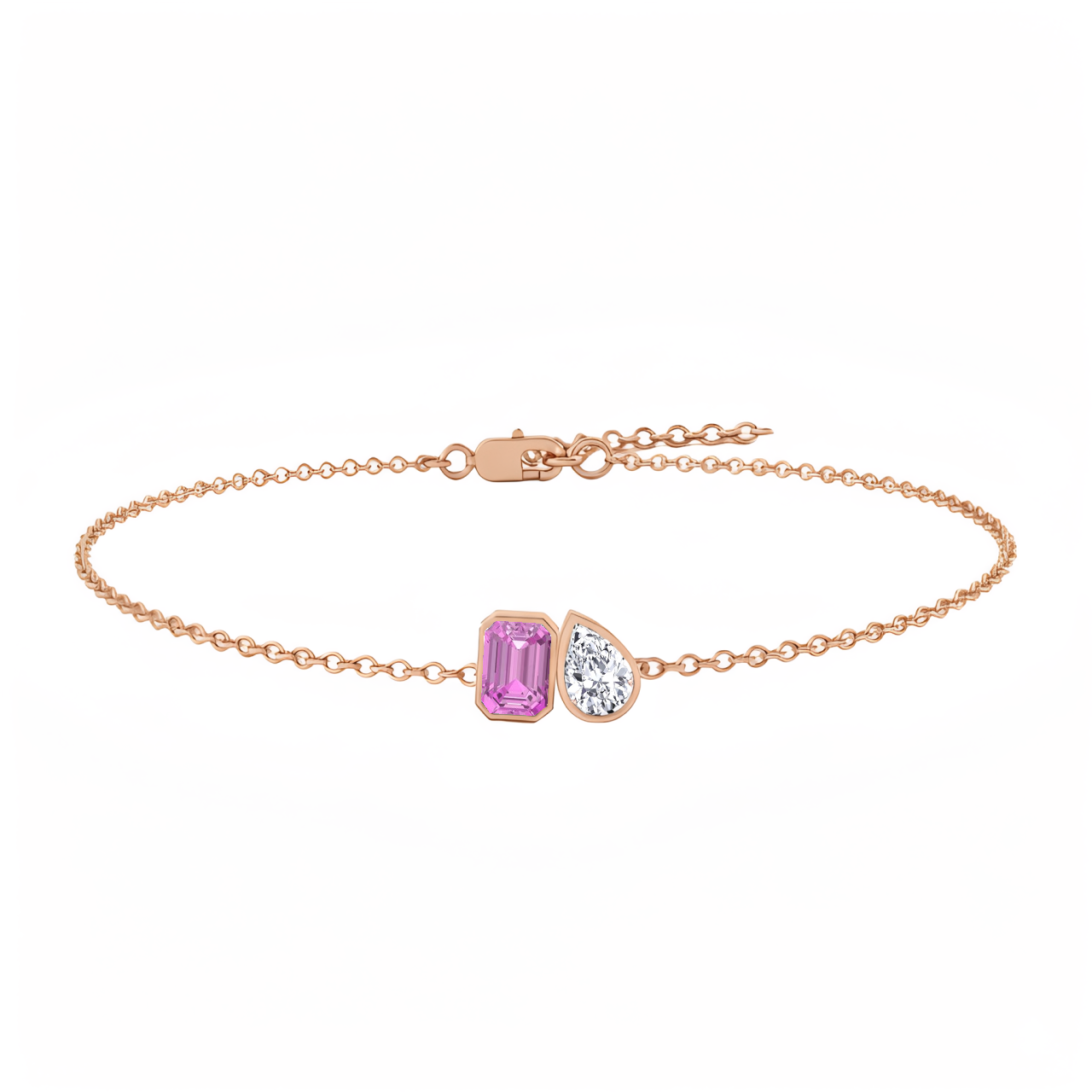 This Natural Pink Sapphire Emerald & Diamond Pear Shape Bezel Set Toi Et Moi Bracelet features an emerald-cut pink sapphire paired with a pear-shaped natural diamond, both secured in sleek bezel settings. The design highlights the contrast between the soft pink sapphire and the brilliance of the diamond in a clean, modern setting. It is finished with a secure lobster clasp and a rolo chain, adjustable from 6 to 7.5 inches for a comfortable fit.
