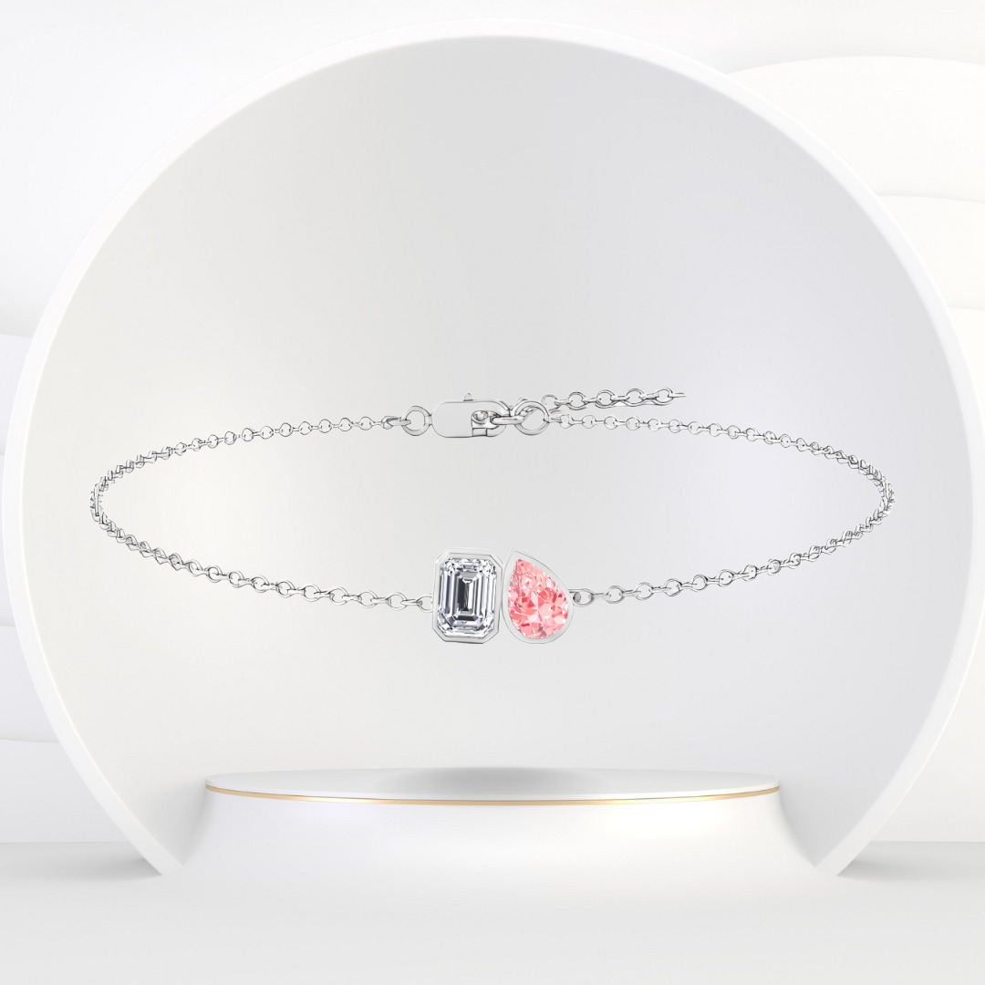 This Natural Pink Sapphire Pear Shape & Diamond Emerald Shape Bezel Set Toi Et Moi Bracelet features an emerald-cut pink sapphire paired with a pear-shaped natural diamond, both secured in sleek bezel settings. The design highlights the contrast between the soft pink sapphire and the brilliance of the diamond in a clean, modern setting. It is finished with a secure lobster clasp and a rolo chain, adjustable from 6 to 7.5 inches for a comfortable fit