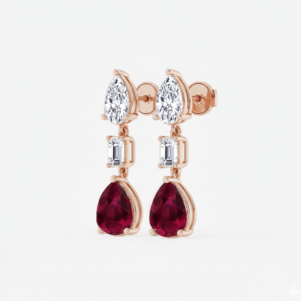 Rose Gold Pear Shape Ruby Natural Diamond Drop Earring side view