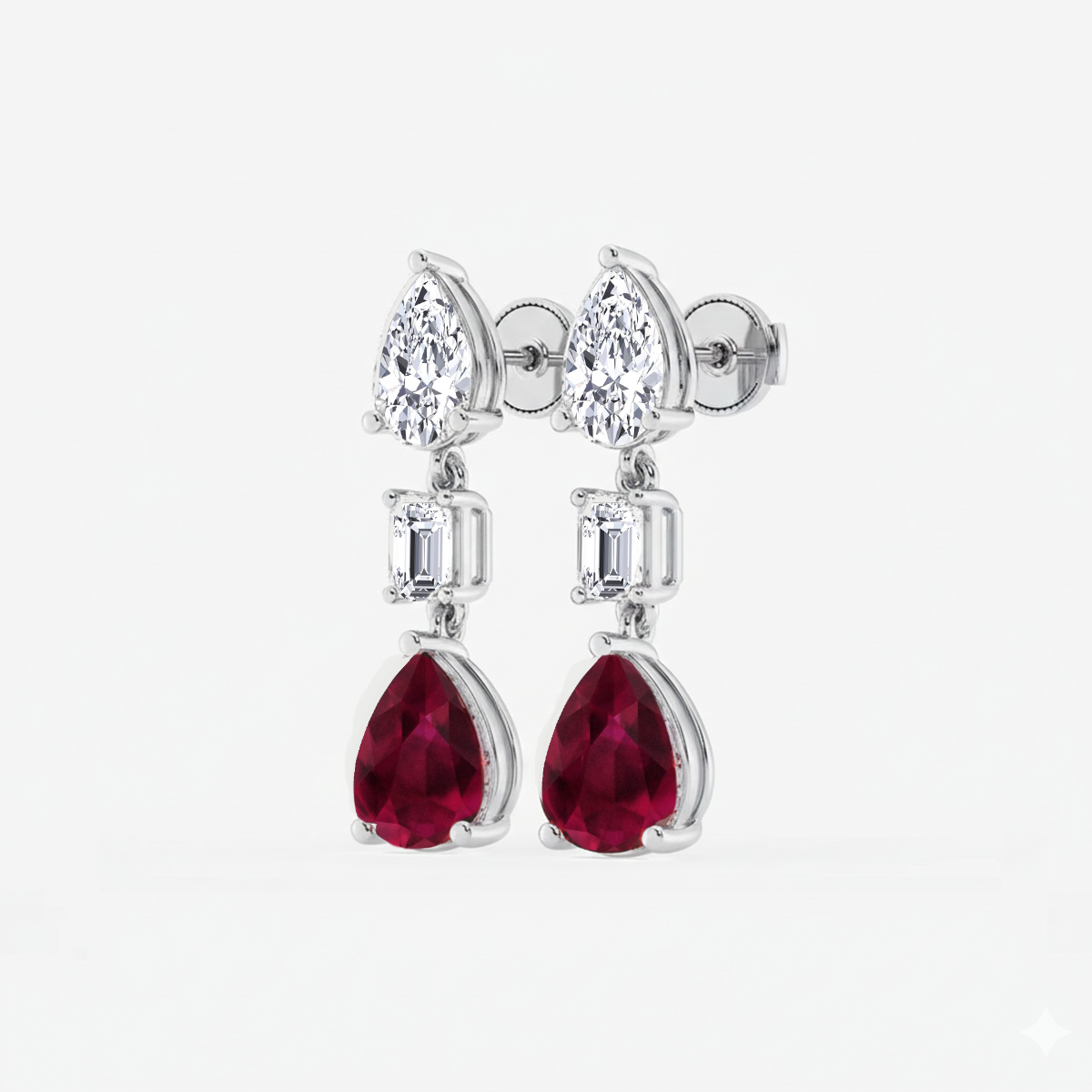 The Pear Cut Red Ruby & Natural Diamond With Emerald Cut Diamond Halo Drop Earrings  are a stunning display of elegance and brilliance. A striking blend of color, designed to elevate any look with timeless sophistication.