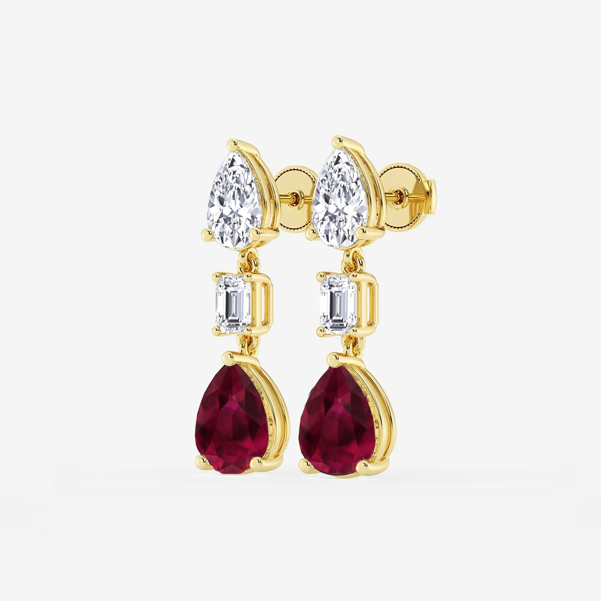 Yellow Gold Pear Shape Ruby Natural Diamond Drop Earring side view