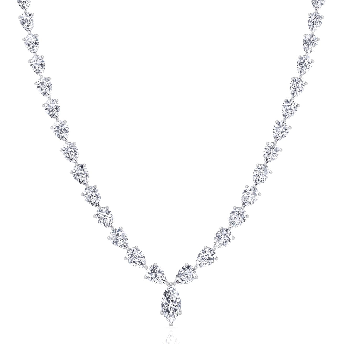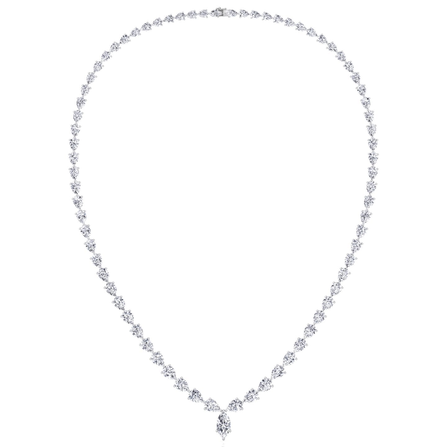 This pear shape natural diamond tennis necklace features a continuous line of pear-shaped diamonds highlighted by a pear-shaped center stone, creating a seamless and elegant silhouette. Designed in an exclusive 17-inch length, it sits beautifully along the neckline for a refined statement that transitions effortlessly from everyday wear to special occasions.