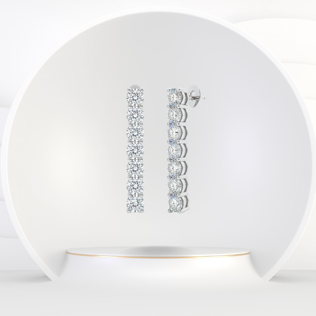 These Round Cut Natural Diamond Tennis Earrings feature a clean 1.5-inch drop designed with a classic shared-prong setting for a continuous line of brilliance. The round diamonds sit closely together, creating a sleek and polished look from top to bottom.